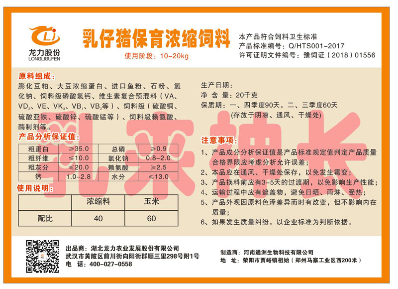 湖北龍力農(nóng)業(yè)發(fā)展股份有限公司坐落于武漢市黃陂區(qū)前川街向陽街群順三里298號附1號。公司成立于2014年6月,公司自成立以來把“創(chuàng)全球最大養(yǎng)豬綜合服務(wù)”為企業(yè)愿景。致力于打造教保料品牌”作為公司發(fā)展的明確目標。公司一直致力于豬營養(yǎng)的研究和開發(fā),積極與國內(nèi)外高校和科研機構(gòu)合作,推廣養(yǎng)豬技術(shù)、動物營養(yǎng)新概念,向世界農(nóng)牧企業(yè)學習與合作。公司采用國內(nèi)先進的生產(chǎn)工藝,選擇高精度電子配料秤,高均勻度、無殘留混合機等先進設(shè)備....